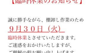誠に勝手ながら、棚卸し作業のため9月30日(火) 臨時休業とさせていただきます。ご迷惑をおかけしますが、ご理解の程お願い申し上げます。野中精肉店